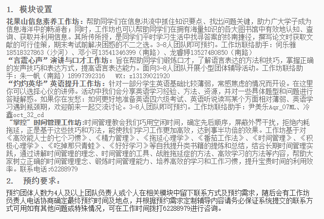 集团提供花果山信息素养工作坊、“言震心声”演讲与口才工作坊、“灼灼英华”英语提升工作坊、“掌控”时间管理工作坊四大模块设置,帮助同学们提升学习能力答疑解惑。填写表单即可完成预约。预约团体人数为4人及以上团队负责人或个人需要在相关模块中留下联系方式及预约需求,随后会有工作坊负责人电话协商确定最终预约时间及地点,并根据预约需求定制辅导内容请务必保证系统提交的联系方式可用。如有其他问题或特殊情况,可在工作时间拨打电话进行咨询。