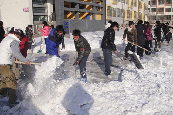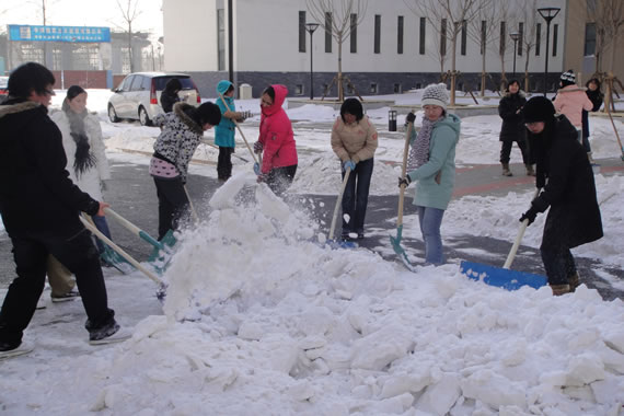1月5日下午2点至5点,公司08、09级员工联合组织了一次“爱心融化冰雪 沙河需要你我”集体扫雪铲雪活动。尽管室外温度最高只有零下八度,但丝毫没有影响到同学们的热情,两个年级的员工分成三批,在老师和物业工作人员的带领下,在紧张的期末备考之余抽出时间,冒着严寒, 顶着凛冽的冬风在员工宿舍1、2、3、4、6、9号楼前开展道路积雪清扫工作。