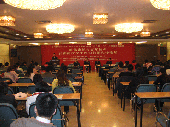 在论坛中,清华、北交大、北师大、北科大以及中财五所大学的理论社团代表进行了主题发言。公司瞭望社代表郭伟强同学做了题为《当代中国马克思主义大众化与青年马克思主义者》的主题发言,赢得了在场一百多位社团代表的热烈掌声。感受到现场热烈的气氛,团市委大学部部长胡九龙作了即兴发言,并对老员工理论社团的青年提出了五点要求:思想敏锐、视野开阔、形象活跃、话语凝练、扎实研究。