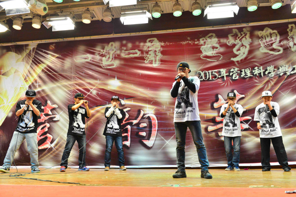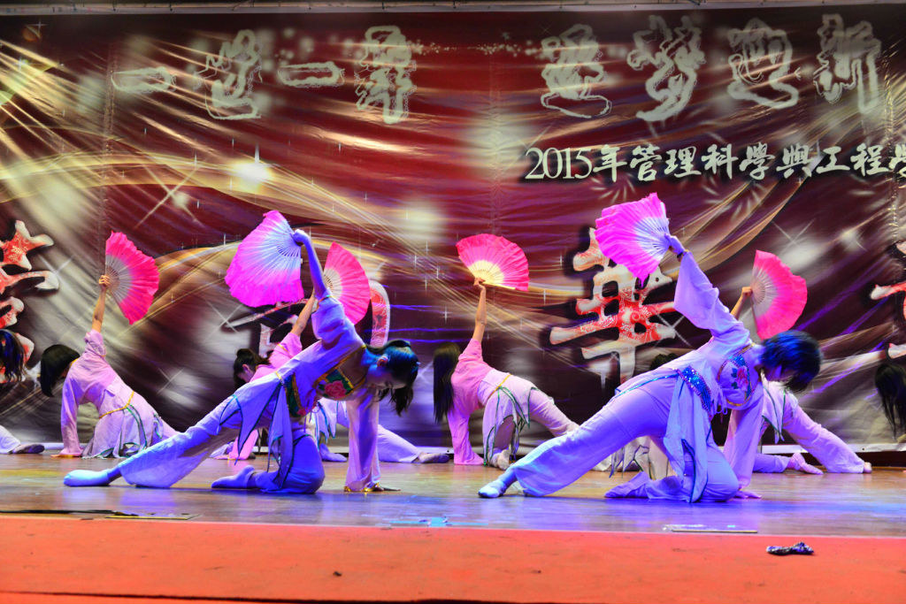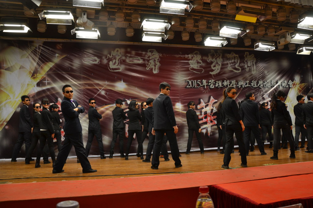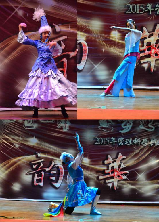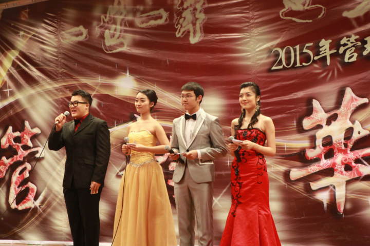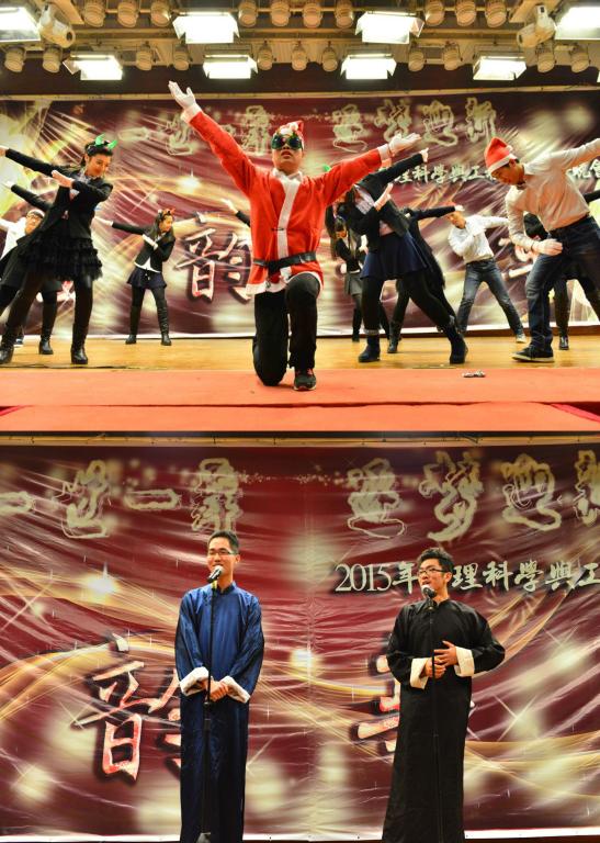 还未从美妙的歌声中回过神来,11级同学就已登上了舞台。据了解11级表演的都是已经保研的同学,看到日常的学霸此刻能歌善舞,彩色荧光的牛角头饰加上一大群男生女生欢快唱跳《barbarbar》,让观众仿佛看到了那个甜美童真的自己。在一群搞怪大咖们跳完舞后,身着长衫大褂的廖原和战昶威便开始“求学问道”了。两个人的这段相声一捧一逗、插科打诨。“运筹学简单啊,贾老师都乐了”、“学霸我可不敢当,叫我学神就好”,一个个贴切管工人学习与生活的段子惹来在场观众频频叫好。