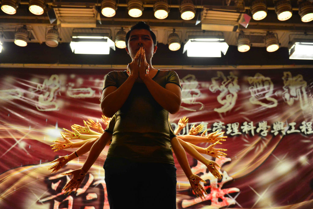 从夜空把心灵拉回地面,由张妍、宋敬仪和若扎分别带来的舞蹈《思乡》、《听》和《撒糖舞》又带来一场视觉的盛宴。草原女子的活泼抑或水乡女子的温婉,都是那样让人喜爱。接着便迎来了工程12班富有趣味的《千手观音》。古铜色的身体站成一列,目力所及的是金色飞舞的千只手在回旋、绽放,格外庄严与壮观。而其后“千手观音”对《上海滩》、《不怕不怕》与《流星雨》的诠释却又即刻拉近了舞者与观众的距离,多了些搞怪、多了些欢笑。最后千手观音在观众们叫好声中退场。