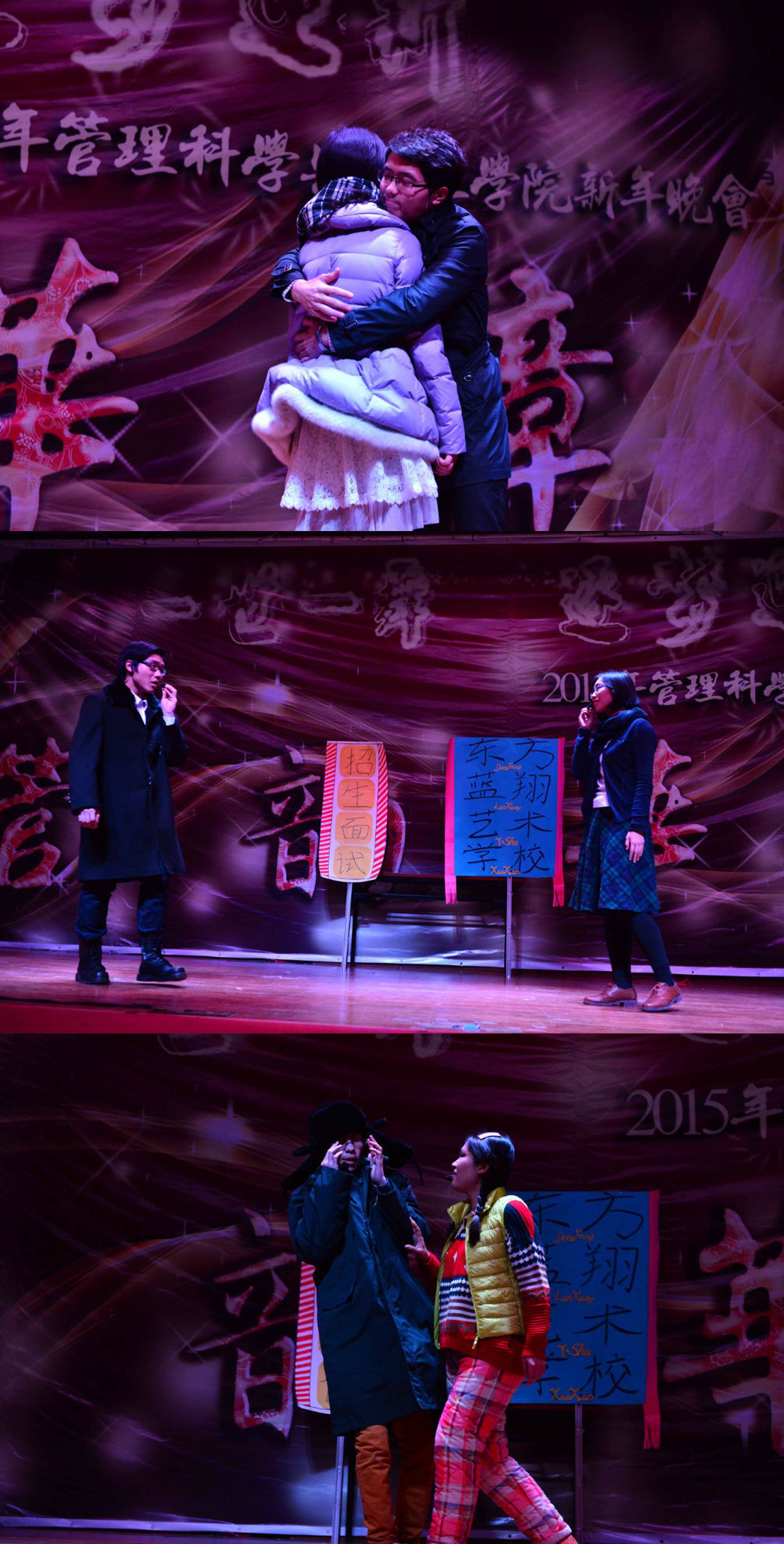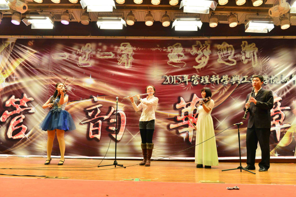 随后,管科13的同学们为我们上演了情意绵绵、精彩纷呈的舞台剧《来自星星的你》。深情款款的韩剧版、夸张幽默的琼瑶版、直爽搞笑的东北版,都因为“东方蓝翔艺术公司”招生面试汇集在一起,也都因为管工大家庭而汇聚于此。紧接着,胡昊楠、查又菲、王玥、张笑竹带来管弦乐合奏:《鸿雁》串音乐之声组曲《多来咪》、《孤独的牧羊人》和《雪绒花》。在优美的和弦中,仿佛夜空也因此变得澄澈,心灵也因此变得纯净……连马里奥都忍不住上台指挥,深深沉醉其中。