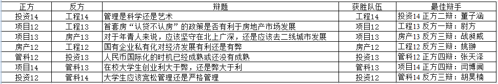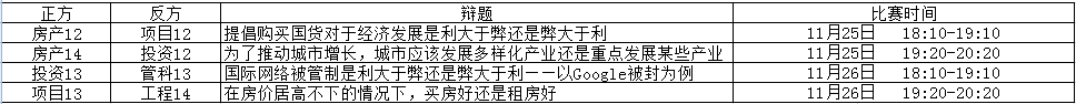 公司第一届专业辩论赛于11月14日开赛,第一轮对阵情况及比赛结果如下:
