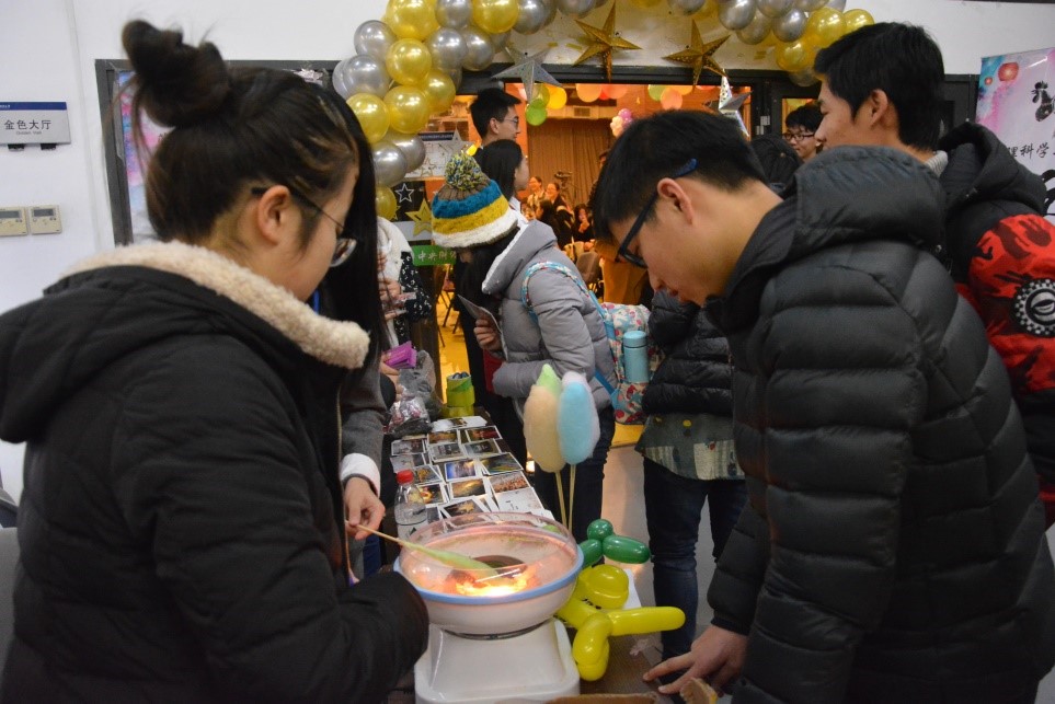 晚会即将开始,工作人员们在会场门口摆放桌椅招待参会观众,为大家提供DIY的棉花糖和印有中财风貌的明信片。