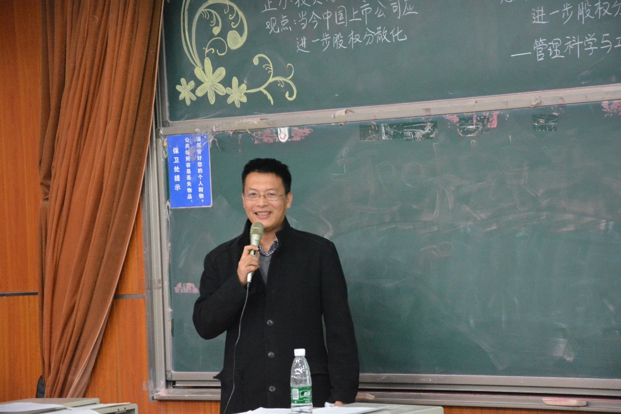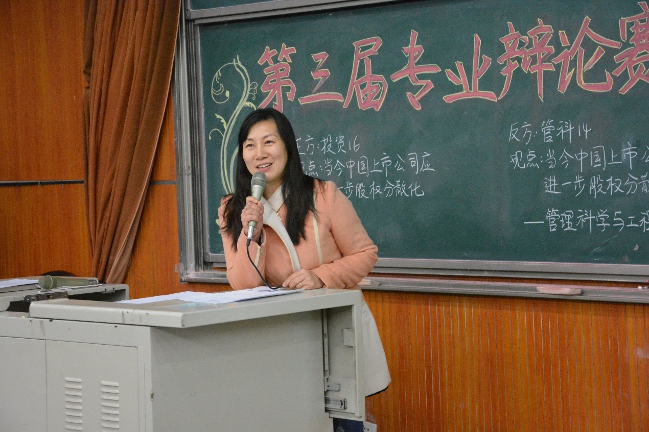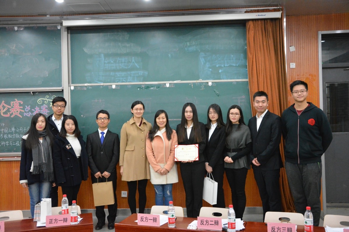 在笑声中结束了妙趣横生的趣味辩论赛,稍作调整后我们就进入了本次专业辩论赛最令人期待的决赛。本场比赛由投资学16代表队(正方)和管理科学14代表队(反方)争夺冠军,他们的辩题是“当今中国上市公司应该/不应进一步股权分散”。