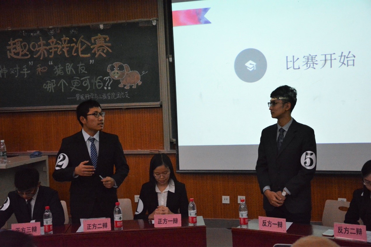 值得一提的是,在正式决赛之前,还有一场以“神对手和猪队友那个更可怕”为辩题的“趣味辩论赛”,可谓妙趣横生!比赛开始前,播放的辩手拉票视频中,各位辩手或搞怪,或轻松,或严肃的自我介绍和拉票话语,顿时使整个辩论赛现场气氛热烈起来。“趣味辩论赛”赛制也与常规辩论赛不同,省去了几个环节,加大了辩论的自由度,双方辩手得以更好地各抒己见,引经据典,更有幽默风趣者,妙语连珠,赢得满堂的笑声与掌声。在激烈的自由辩论环节,双方辩手在逻辑严密中又不失活泼,一次次妙绝的回击与进攻,使比赛进入白热化阶段,而台下观众也随之思维起舞,又有笑声连连。虽然这场趣辩不评判胜负队伍,但双方也是竭尽全力,为评委老师,嘉宾老师和观众们呈现了精彩纷呈的比赛。而现场观众的犀利且有见地的提问更成为比赛的又一亮点。