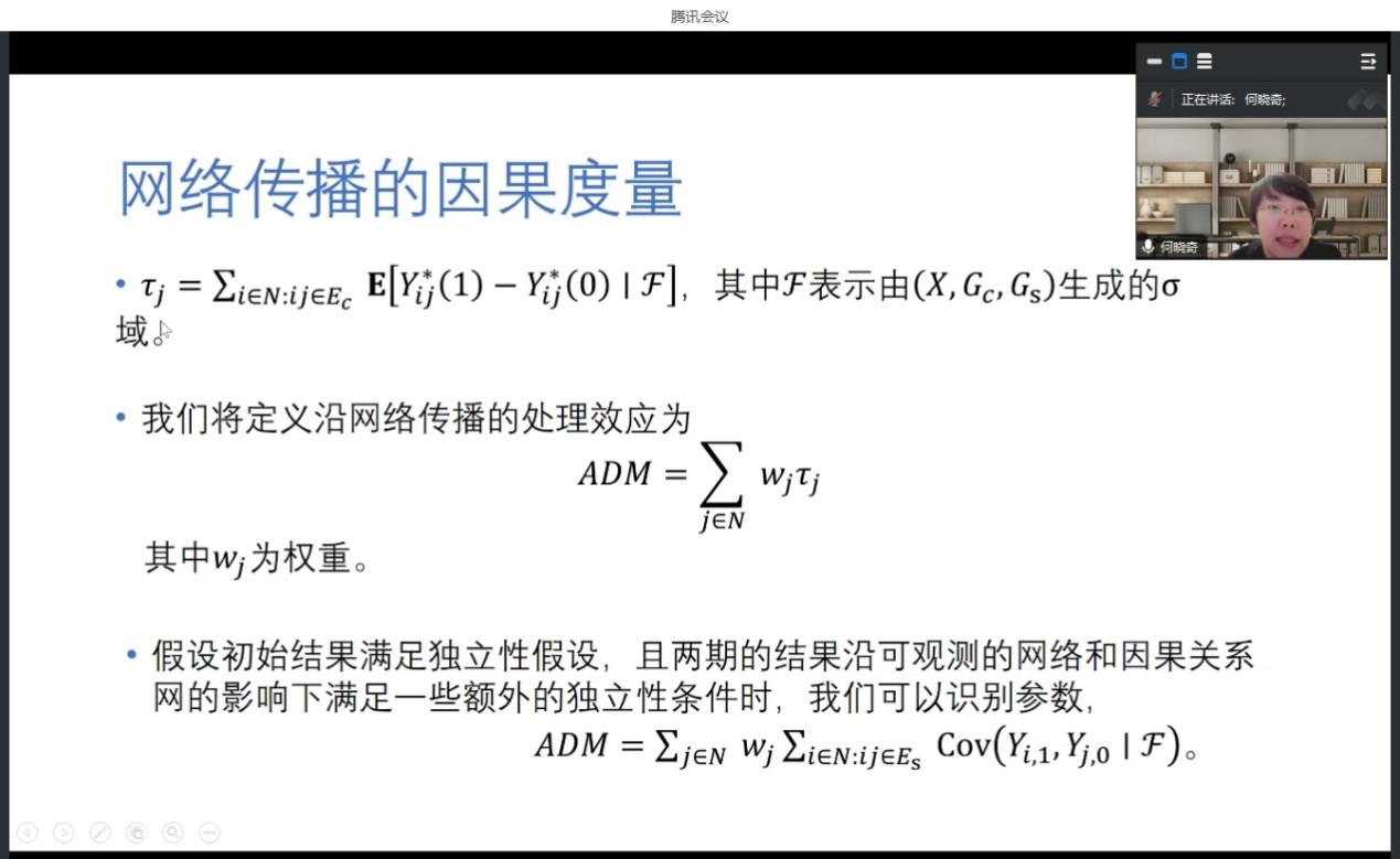 第二场学术讲座由公司何晓奇助理教授主讲。讲座分为两部分,第一部分介绍了在顶级经济学期刊The Review of Economic Studies接收发表的研究成果“Measuring diffusion over a large network”,论文主要分享了建模过程,该论文的主要贡献是在社会网络模型下,确立了个体行为交互影响的溢出效应是来自关系网络,而不是个体特征,或者其他的环境相关性造成的,这对推动因果关系在网络溢出效应的理论发展具有重大意义。第二部分分享了自己的研究历程和一些心得体会,研究需要有兴趣也需要有毅力,此外踏实的基本功,持续的文献梳理和学习都是研究的必要手段,借此与同学们共勉!
