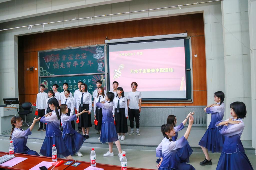 最后,大会上演了以“南陈北李,相约建党”为主线的历史情景剧。同学们亲身扮演陈独秀、李大钊等革命家。声情并茂、充满激情的表演仿佛把观众带回了那个奋进的年代,引起台下热烈掌声。一曲《不忘初心》,在场师生们自发跟唱,挥舞手中的红旗。在动听的旋律和舞团精彩的舞蹈中,五四表彰大会画上了圆满的句号。