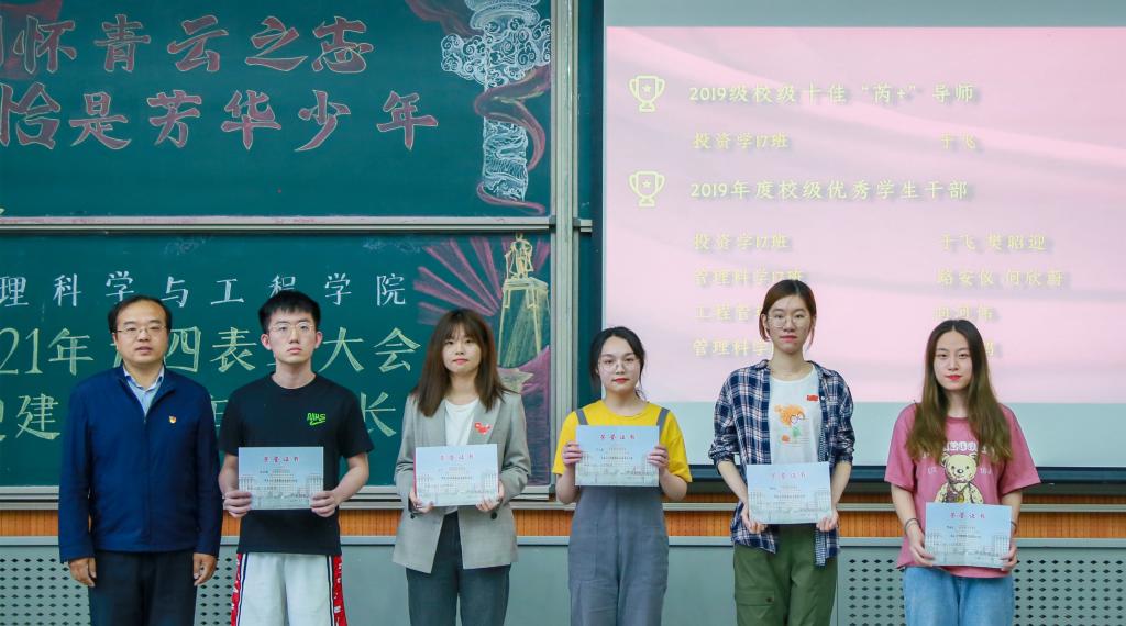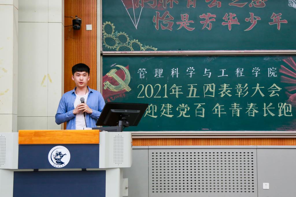 坚定理想信念,勇担青年使命。来自管理科学17班的武晖栋作为优秀个人代表给我们带来了他的奋斗故事。他从公司志愿服务经历到作为国庆70周年志愿服务的亲历者,在志愿服务中寻找学习的意义,奋斗的目标。他提到,身处竞争的激流中,我们应明确学习目的,唯有在知行合一中主动担当作为,执着奋斗,将个人的奋斗融入党和人民的事业中,才不至于在“内卷化”中迷失自我,同时也让自己的奋斗有了正确的方向和源源不断的动力。他号召同学们在百年未有之大变局的今天,主动奉献,勇于担当,将青春热血挥洒在祖国和人民最需要的地方。