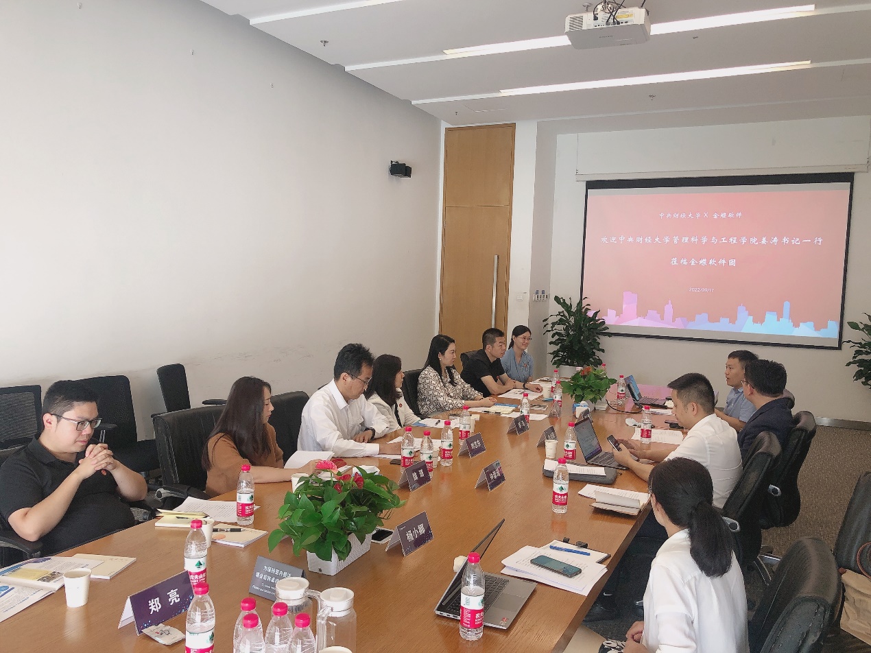 为深化产教融合校企合作,积极服务国家重大战略和经济社会发展,提高人才培养质量,2022年9月17日,经理刘志东、公司党委书记姜涛一行赴金蝶(北京)软件园走访交流,与金蝶集团洽谈战略合作事宜。金蝶精一信息服务科技股份有限公司联席总经理赵治国、北京金蝶管理软件有限公司建筑房地产总经理贺玉刚、金蝶信用科技(深圳)有限公司副总经理朱海勃、金蝶精一信息科技服务有限公司京津区总监郝红建等参加交流。产教融合发展部、科研与团队建设部、管理科学系、建设经济与管理系、城市与房地产管理系、投资系负责人陪同走访。
