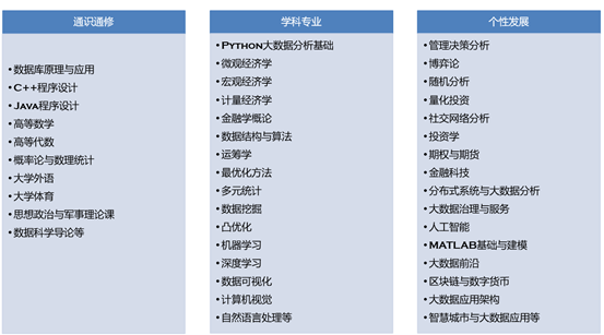 “许国志大数据英才班”合作双方在培养方案制定过程中,以世界著名大学,例如哈佛大学、斯坦福大学、卡耐基梅隆大学、纽约大学、哥伦比亚大学等全球领先的大数据专业作为对标,尝试取长补短制定合理的课程体系。采用灵活的先进的培养模式,充分体现“厚基础、宽口径、重能力”的培养思路。