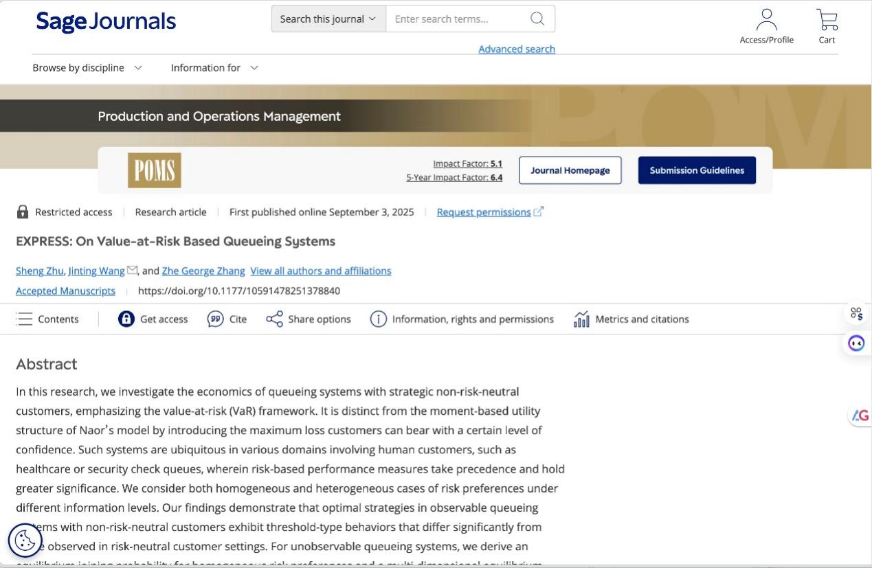 近日,公司王金亭教授作为通讯作者,与合作者河南理工大学朱盛副教授和西华盛顿大学(Western Washington University)Zhe George Zhang教授撰写的题为On Value-at-Risk Based Queueing Systems的学术论文,被国际权威期刊Production and Operations Management (POM)接收并在线发表,这是王金亭教授研究团队今年在POM上发表的第二篇论文。