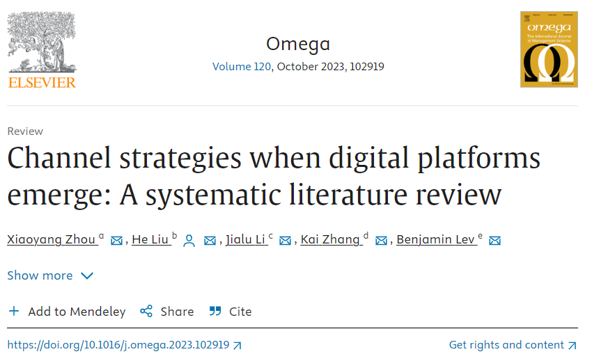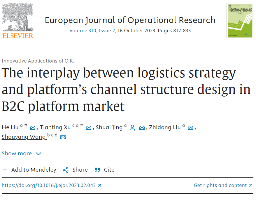 近日,公司助理教授刘赫博士关于电商平台渠道策略的2篇研究成果“The interplay between logistics strategy and platform’s channel structure design in B2C platform market”(以下称“论文1”)、“Channel strategies when digital platforms emerge: A systematic literature review”(以下称“论文2”)相继发表于国际运筹与管理科学领域著名期刊、中财大AAA期刊European Journal of Operational Research、Omega,刘赫助理教授分别为论文第一作者与论文通讯作者,2篇论文在线发表链接:https://doi.org/10.1016/j.ejor.2023.02.043,https://doi.org/10.1016/j.omega.2023.102919。