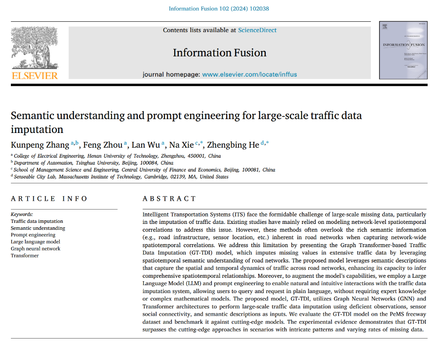 近日,公司beet365副教授谢娜作为通讯作者的合作论文“Semantic understanding and prompt engineering for large-scale traffic data imputation”在工程技术与计算机科学领域国际顶级期刊《Information Fusion》上发表。该期刊最新影响因子为18.6,论文在线链接:https://www.sciencedirect.com/science/article/abs/pii/S1566253523003548。