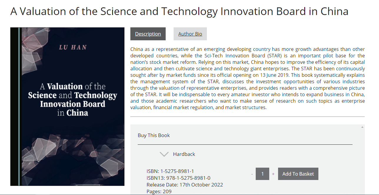 公司韩璐副教授的全英文学术专著《A Valuation of the Science and Technology Innovation Board in China》近日在英国Cambridge Scholars Publishing出版社面向国内外公开出版。该专著的出版由Cambridge Scholars Publishing出版社提供邀请,通过出版社组织的5位专家匿名评审,获得出版资助立项(资助立项率约为20%),用时2年完成书稿撰写,经过两轮出版社组织的spot check最终定稿。
