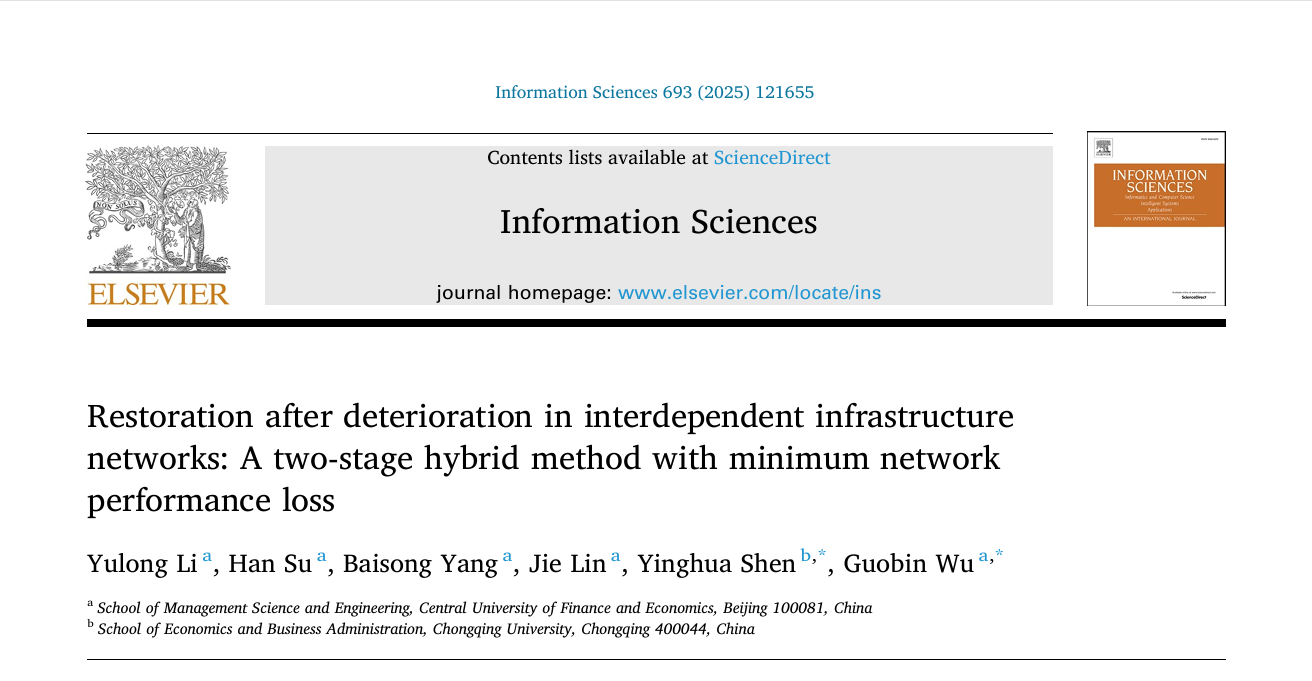 近日,李玉龙教授作为第一作者,公司青年教师吴国滨和重庆大学申映华副教授作为共同通讯作者,与公司2024级博士生苏涵、2022级本科生杨柏松和2019级研究生林杰同学合作的学术论文“Restoration after deterioration in interdependent infrastructure networks: A two-stage hybrid method with minimum network performance loss”被公司AAA期刊《Information Sciences》录用,体现了信息技术与数据科学对解决工程管理问题的支撑作用以及跨学科交叉融合在科技创新领域中的重要性。