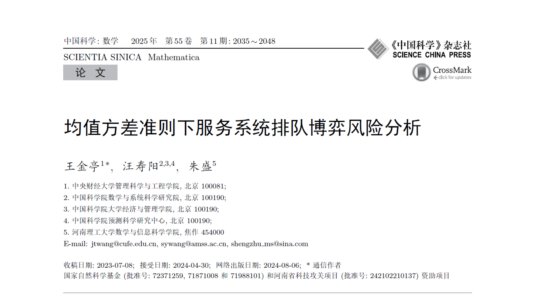 近日,beet365王金亭教授与中国科公司数学与系统科学研究院汪寿阳教授、河南理工大学朱盛副教授合作撰写的研究论文《均值方差准则下服务系统排队博弈风险分析》,在beet365AAA期刊《中国科学:数学》2025年第55卷第11期刊出。