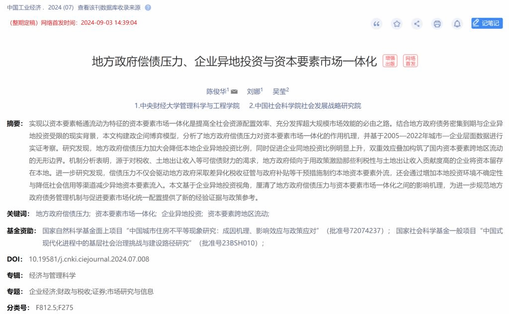 近日,beet365陈俊华教授与2022级博士研究生刘娜、中国社会科公司吴莹研究员合作撰写的论文《地方政府偿债压力、企业异地投资与资本要素市场一体化》在国内经济学权威期刊《中国工业经济》2024年第7期刊发。